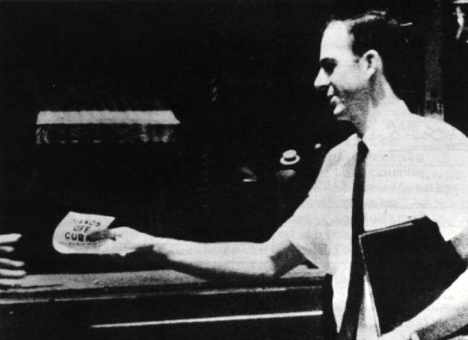 The pamphlets he is handing out are stamped with “554 Camp Street” address. Warren Commission apologists maintain that Oswald had no rented office at the address. Guy Banister, the conservative, anti communist former FBI agent turned private eye, did maintain an office there. Under the official story, Oswald did not work for Banister, nor did they know each other. Independent researchers maintain they did, based on numerous eyewitness reports, including Banister’s secretary who said she saw Oswald passing through the office on more than one occasion.