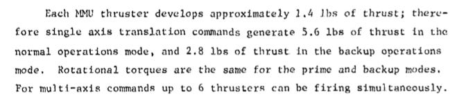 What Higginbotham proposes here is impossible to the point of being absurd. From NASA’s own documents, the MMU can only produce 33.6 lbs of thrust on the low end and 134.4 lbs at the high end being issued from a set of 24 nitrogen thrusters. Hardly enough thrust to generate this massive velocity.