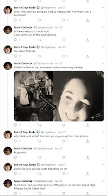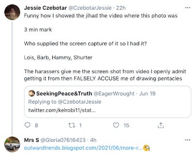 For over a year now Jessie has been saying she was in the 1901 photo drawing a pentagram with two other girls. Now in a surprising turn around, she is claiming her critics are “falsely claiming” she drew the images. Amazing! It's an absurd lie. Just see the picture above where she claims to be the middle girl in the picture. And more than once, as she has been leaving a digital Twitter trail saying she was drawing them! She uses the picture in all of her media. Notice the misuse of pentagram as “pentacales,” which is misspelled but means pentagram.