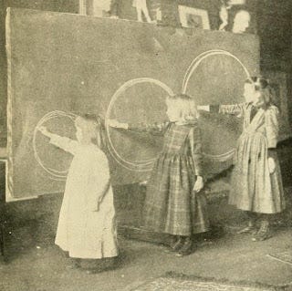 Don’t the girl’s dresses look a tad old fashioned? As I found out from Barbara Roberts via Twitter, the picture is actually sourced from an educational art book published in 1901. From the original image below, it is apparent that the pentagrams were added.